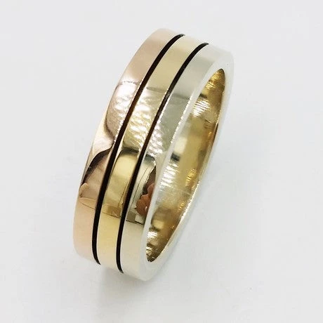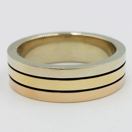 L’espace laissé libre entre les anneaux en or est traité au rhodium noir, aussi appelé or noir afin d’augmenter le contraste des couleurs entre chacun des 3 ors et de donner de la profondeur aux trois anneaux de la bague.