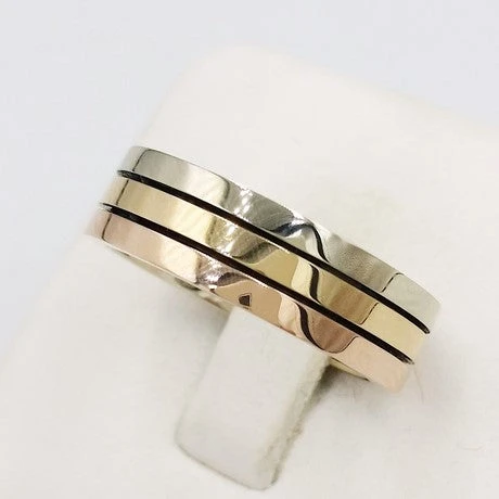 La bague est constituée de trois anneaux d’or 18 carats de trois couleurs différentes: dans l’ordre or blanc, or jaune et or rose montés soudés sur un anneau interne en or blanc 18 carats.