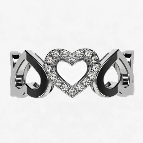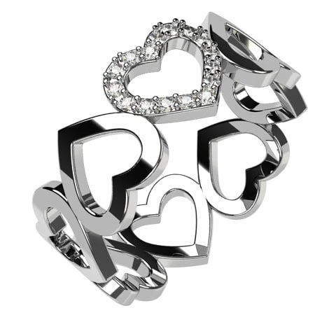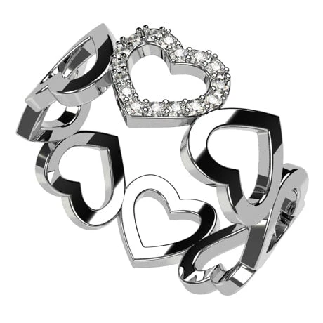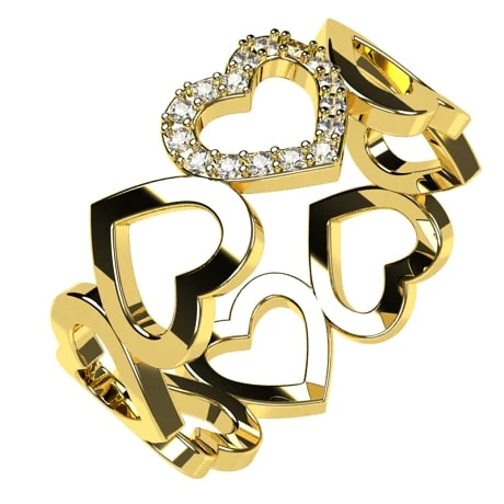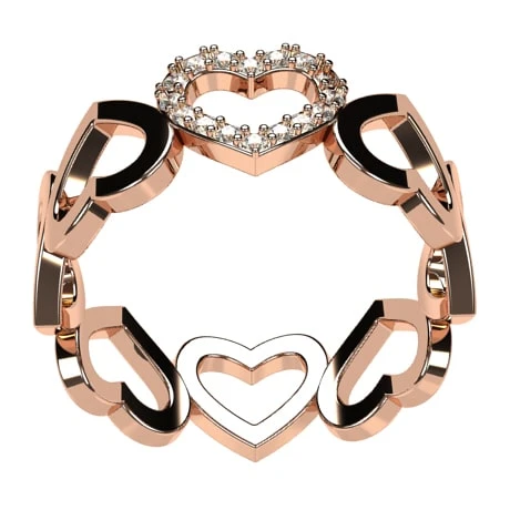 Alliance féminine composée de 8 petits coeurs inversés les uns par rapport aux autres et dont l’un d’eux est sertis de 16 petits diamants, composant la partie centrale de la bague. Symbole d’amour récurrent de la joaillerie, le coeur sert ici de support afin de confectionner une bague pour un homme voulant témoigner son amour pour sa conjointe.
