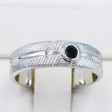 Alliance originale de type bandeau large pour homme présentant un motif texturé sur la face visible de l’anneau, lequel est orné d’un diamant noir solitaire sertis clos de 3 millimètres de diamètre.