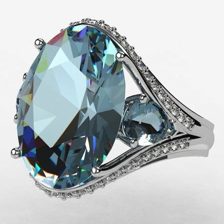 Grande, sompteuse et impressionnante. Les adjectifs ne manquent pas pour ce design de bague totalement original et mettant en valeur une énorme pierre d’aigue-marine taillée ovale faisant 18 millimètres de long par 13 millimètres de large.