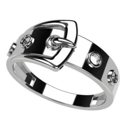 Design unique de bague en forme de boucle de ceinture dĂ©taillant la ceinture en elle-mĂŞme qui forme le corps de bague, la boucle de ceinture, la dent de fermeture ainsi que 4 crans de rĂ©glage de la ceinture lui donnant une apparence proche d’une ceinture rĂ©elle.