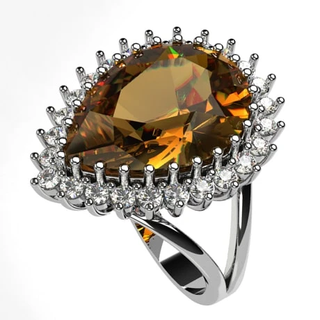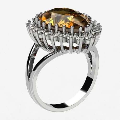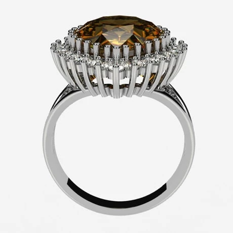La pierre de citrine sertie sur cette bague ne risque pas de s’échapper, puisqu’elle est sertie par 25 griffes qui la maintiennent en place, ces dernières ayant plus une fonction visuelle que mécanique, elles accompagnent en effet les 25 petits diamants de 1,8 millimètres qui sont sertis de 3 griffes et qui entoure la citrine. Celle-ci est en effet entouré d’un halo de diamant lumineux qui offre un joli contraste avec la couleur chaleureuse de la pierre de citrine.