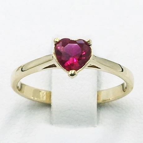 Cette bague de fiancailles présente un joli rubis rouge naturelle taillé en forme de coeur et sertie au centre de la bague. L’anneau est simple avec une monture elle aussi classique afin de mettre en valeur de la manière la plus sobre possible cette jolie pierre précieuse offrant un rouge un intense.