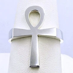 Cette bague se compose d’un anneaux épais dont les flancs connectent avec les bras de la croix Ankh. La boucle de la croix Ankh est ajourée et la croix dans son ensemble respecte les proportions des croix de vie égyptiennes antiques.