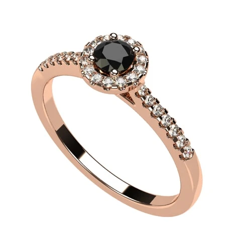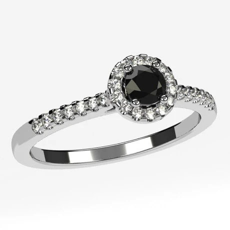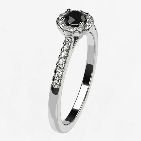 Le design de bague proposé montre un diamant noir de 3,5 millimètres de diamètre au centre d’un halo de 14 petits diamants blancs de 1 millimètre de diamètre, taillés en brillant. Le corps de bague est décoré de 14 petits diamants (7 sur chaque bras) de diamètre allant de 1 à 1,2 millimètre et sertis griffe eux-aussi. Tous les diamants sont de qualité HSI et l’ensemble des 29 diamants de la bague totalisent un poids de 0,33 carat de diamant.