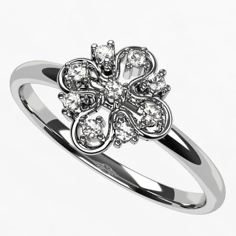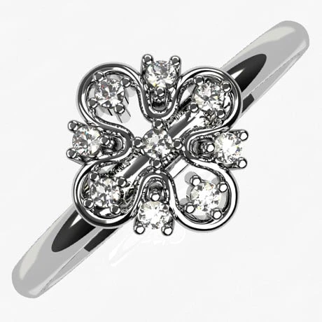 Cette jolie petite bague présent un motif de fleur à 4 pétales sertis de diamants montée sur un anneau simple. Ce design épuré ravira une personne à la recherche d’une bague de fiançailles économique qui a du charme et qui séduit au premier coup d’oeil.