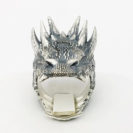 Cette grosse bague masculine montre une tête de dragon représentée la gueule ouverte au travers de laquelle passe votre doigt. Vous pouvez voir sur les photos de la bague le niveau de détails de cette bague dragon représentant le cuir du dragon, les nombreuses dents dans la gueule, le détail des naseaux ainsi que les nombreuses cornes sur le sommet de la tête de dragon.