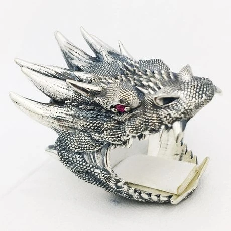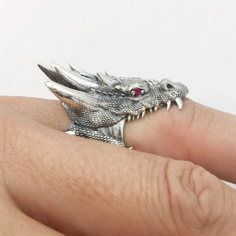 - Avec rubis: l’oeil de dragon est reprĂ©sentĂ© par une pierre de rubis bien rouge qui contraste parfaitement sur l’argent de la bague et donne un aspect fĂ©roce unique Ă la bĂŞte