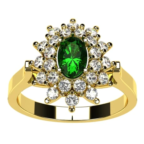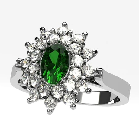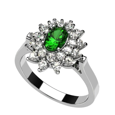 Cette bague de fiançailles pour femme prenant la forme d’une bague panier recevant 24 petits diamants de 1,7 millimètre de diamètre de qualité GVS sertis griffe ainsi qu’une pierre précieuse principale ovale de 6 x 4 millimètres sous la forme d’une pierre d’émeraude.