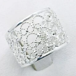 Bague filigrane pour femme au design fin et léger. Celle-ci est composée d’une armature sur les bords de la bague faisant 1 millimètre de large et l’espace compris entre ces armatures est rempli d’arabesques faites avec un fin fil d’argent torsadé.