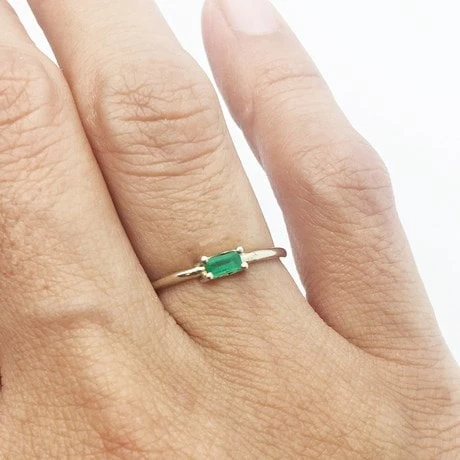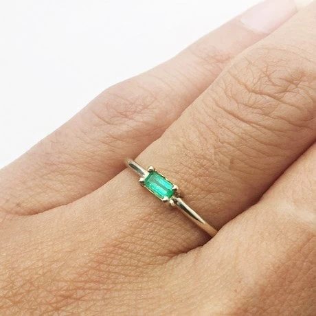 Cette bague est faite pour une femme aimant les bagues fines et colorée et qui est à la recherche d’une bague avec une petite pierre d’émeraude solitaire qui sera facile à porter au quotidien et néanmoins très voyante au doigt.