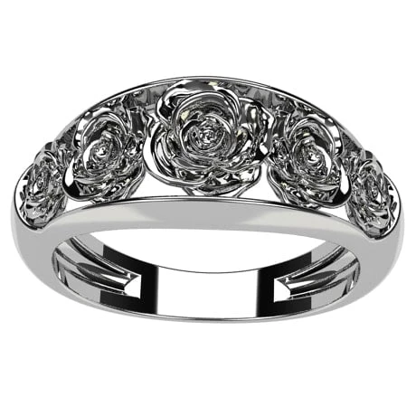 Bague présentant cinq fleurs de rose détaillées avec leurs pétales et disposées autour du doigt sur la moitié supérieure au milieu de l’anneau de bague qui est ajouré en son centre.