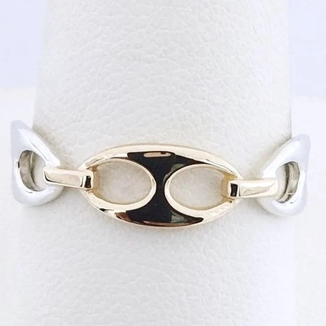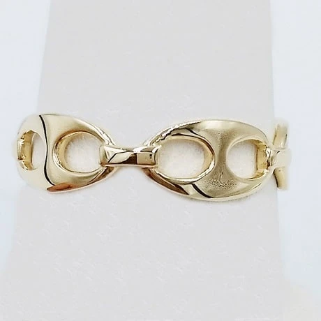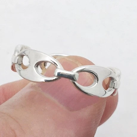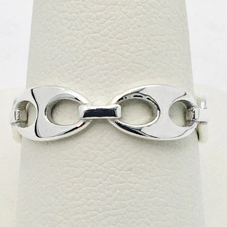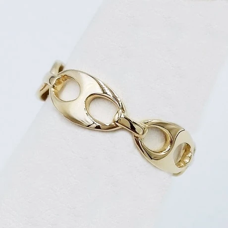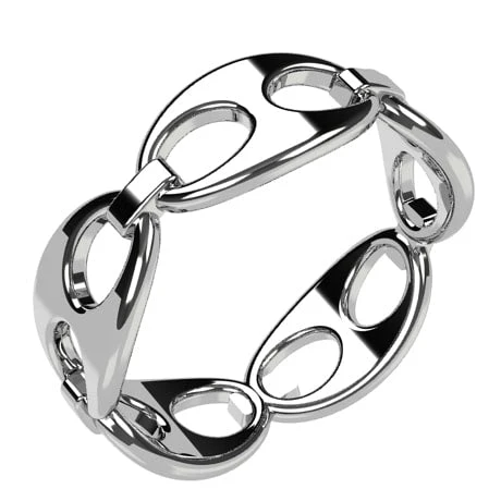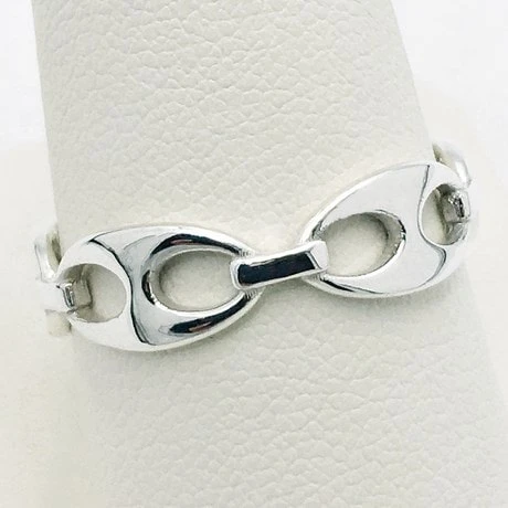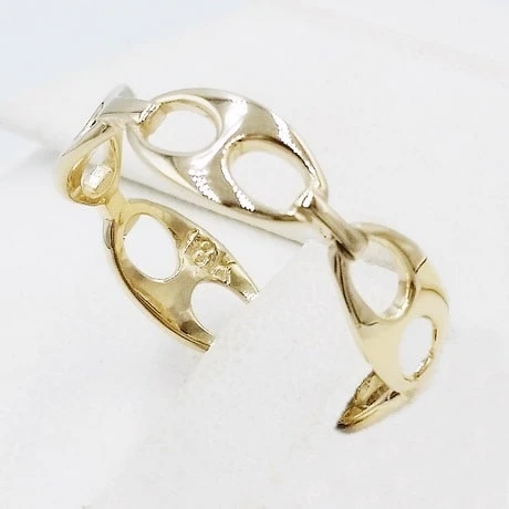 Bague reprenant le design d’une chaîne grain de café composée de 5 maillons large reliés par des liens rigides. Il s’agit bien d’une bague ronde et non souple composée de maillons soudés les uns aux autres.