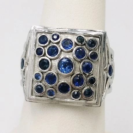 Bague large et imposante, au design masculin et original prĂ©sentant un large plateau carré recouvert de pierres prĂ©cieuses de saphirs bleus sertis clos. Vous remarquerez au passage que le plateau de bague n’est pas plat mais ondulĂ©, donnant un effet de style très original Ă cette bague.
