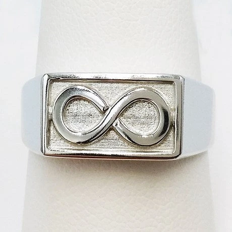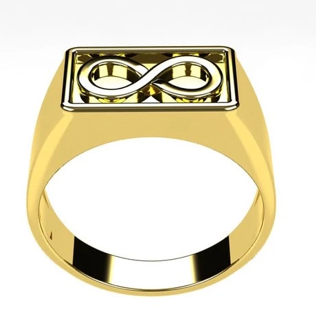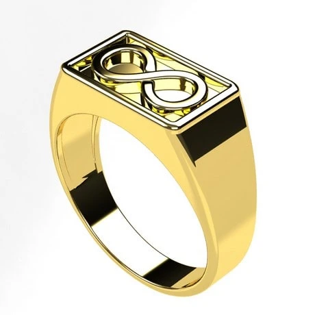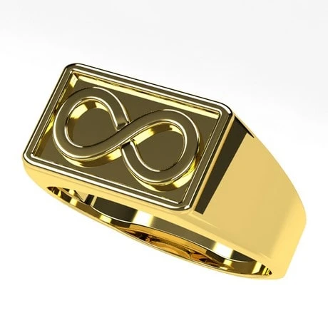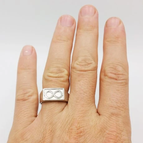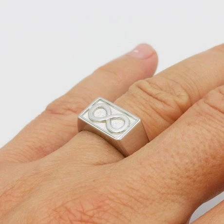 Bague de type chevalière avec un plateau rectangulaire avec au centre le signe infini moulé en relief. Vous remarquerez le décroché au centre du signe infini, là où se croisent les deux bras, donnant de la profondeur au signe.