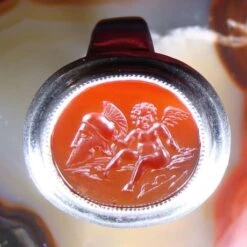 Alliant symbolisme antique et élégance contemporaine, cette chevalière en argent massif met en valeur une intaille romaine finement gravée sur une pierre naturelle de cornaline. Elle représente Cupidon, dieu de l’amour, assis à côté d’un casque de guerrier, incarnation de la dualité entre amour et guerre. On peut voir son arc et sa flèche posés à côté de lui. La pierre de cornaline est ovale, elle fait 14×12 millimètres et elle est montée dans le sens du doigt.