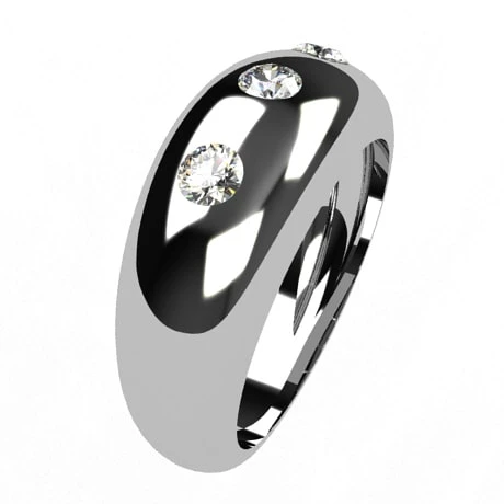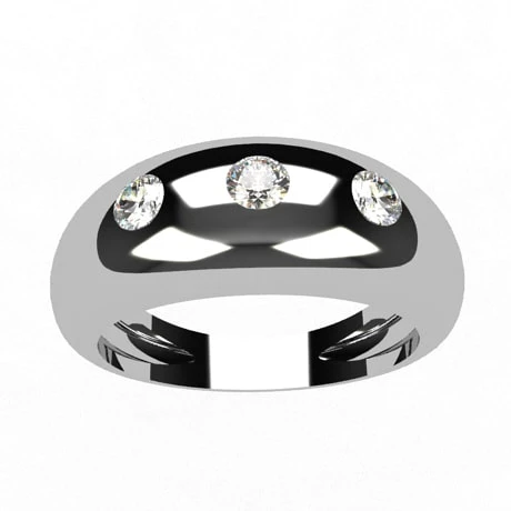 Cette bague est sertis de trois diamants blancs de 2,5 millimètres taillé en brillant. Ces diamants sont de couleur H et de pureté SI et pèsent 0,055 carat chacun. Ces diamants est sertis masse assurant une tenue parfaite au cours du temps et le poids total de diamant de la bague est de 0,165 carat.