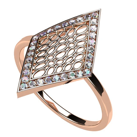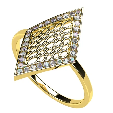 Le losange est grand, prenant toute la partie supérieure du doigt, il est composé d’une bordure massive décorée de 32 petits diamants ronds sertis griffe qui illuminent son pourtour alors que le centre du losange est décoré d’une structure alvéolaire d’inspiration organique qui lui donne un style moderne et léger.
