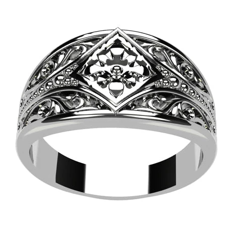 C’est pourquoi nous avons voulu proposer ces deux designs de bagues, différentes, mais toutes deux inspirées du style médiévale. La première est une bague bandeau de type alliance alors que l’autre est inspirée d’un design de chevalière.