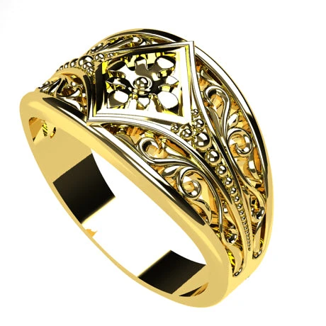 La seconde bague, de type chevalière est un anneau élargie faisant 12 millimètres de large en partie supérieure et seulement 4 millimètres de large en partie inférieure. Les montants et la partie supérieure sont ornés de motifs floraux, de milegrains et d’une fleur centrale du plus bel effet. Notez que les motifs floraux sont ajourés, allégeant le design de bague.