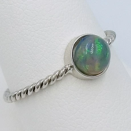 La bague est surmontĂ©e d’une pierre d’opale noble colorĂ©e et taillĂ©e en cabochon de 6 millimètres de diamètre. Elle est sertie de manière très sĂ»re sur la bague, laissant apprĂ©cier toutes les couleurs vives de la pierre.