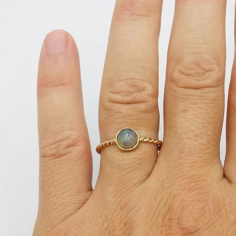 Cette bague opale pour femme prĂ©sente un design des plus simple tout en Ă©tant original. La bague est surmontĂ©e d’une pierre de cabochon ronde de 6 millimètres de diamètre. Celle-ci est sertie clos sur une base qui est soudĂ©e au corps de bague fait de fils d’or torsadĂ©s donnant un style texturĂ© sobre et rustique Ă la bague.
