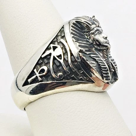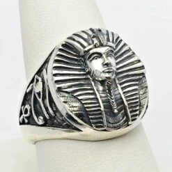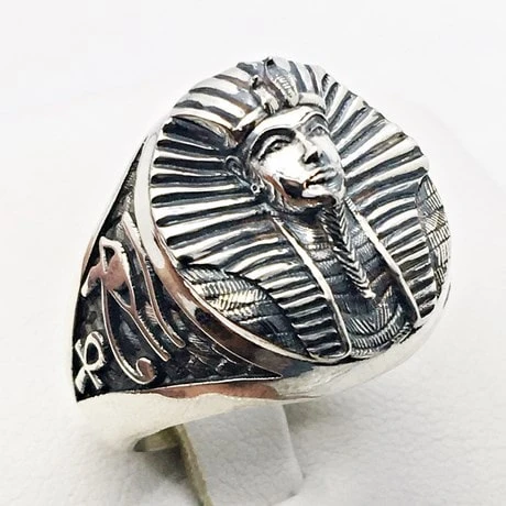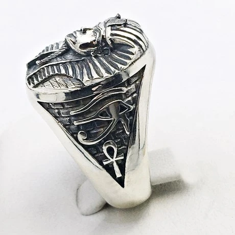 Cette bague séduira un amoureux de la culture Égyptienne à la recherche d’une bague pharaonique détaillée et porteuses des symboles classiques de la royauté antique Égyptienne.