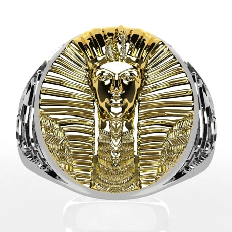 Bague de type chevalière au plateau ovale présentant un large corps de bague décoré de gravures et moulures en reliefs de symboles Égyptiens et dont le plateau supérieur est occupé par une moulure en relief de la tête du Pharaon représenté avec tous les attributs de pouvoir du souverain Égyptien.