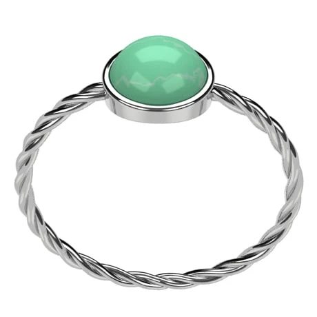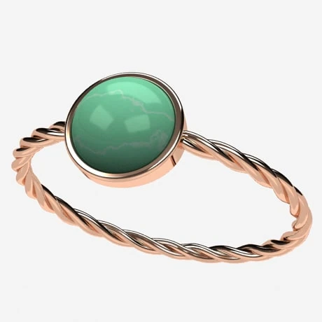 Bague légère et féminine composée d’un corps de bague fait de fils d’or torsadé et présentant une pierre de jade naturelle sertis clos au sommet de la bague. La pierre de jade est présentée sous forme d’un cabochon de 6 millimètres de diamètre.