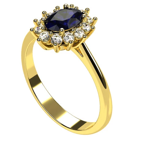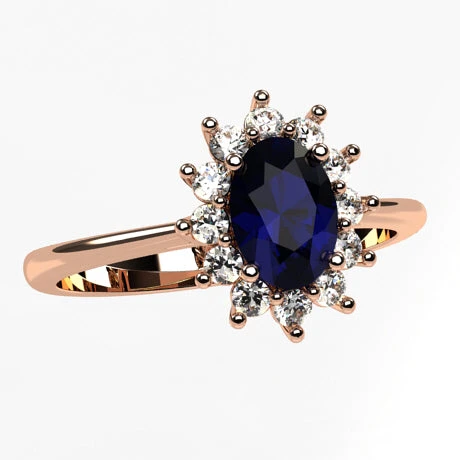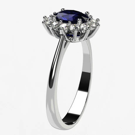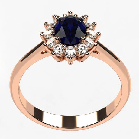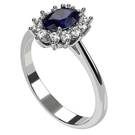 Cette bague de style pompadour se caractérise par une pierre centrale ovale entourée de 12 petits diamants sertis griffe, qui font ressortir la couleur de la pierre principale de saphir bleu.