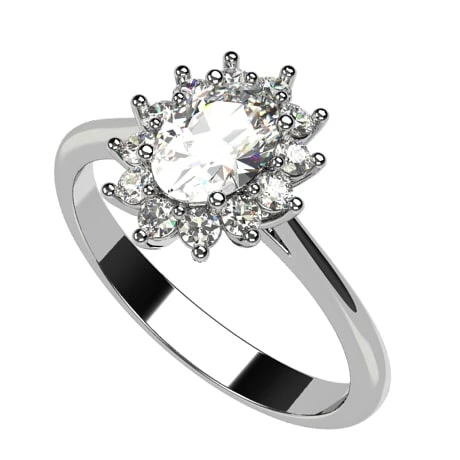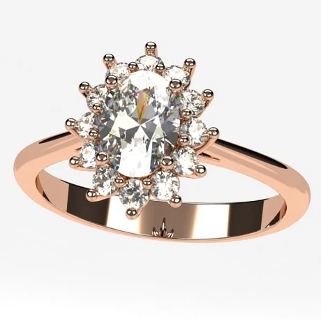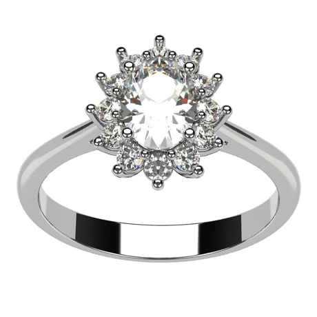 Cette bague de style pompadour se caractérise par une pierre centrale ovale entourée de 12 petits diamants sertis griffe, qui mettent en valeur la pierre principale de diamant.