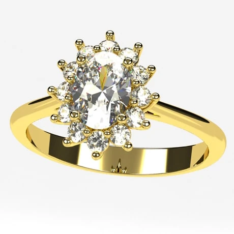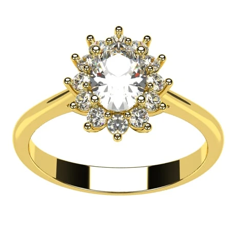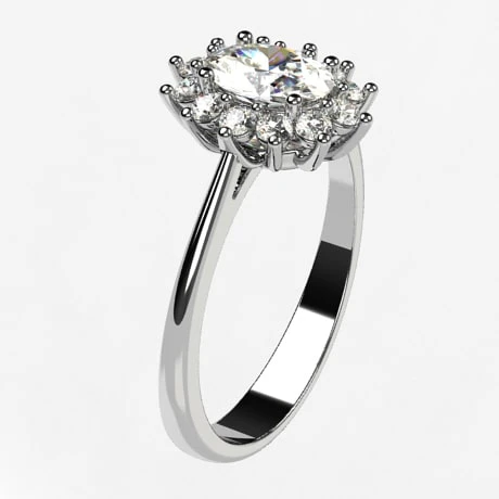 Cette bague en particulier prĂ©sente une pierre prĂ©cieuse de diamant de 7 millimètres de longueur par 5 millimètres de largeur et d’un poids de 0,55 carat de couleur G et de puretĂ© SI2. Cette dernière est entourĂ©e de 12 petits diamants blancs taillĂ©s en brillant de 1,8 millimètre de diamètre et totalisant en tout un poids de 0,25 carat de diamant. Ces derniers dont de couleur G et de puretĂ© VS2.Â
