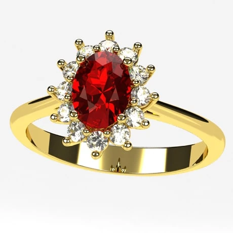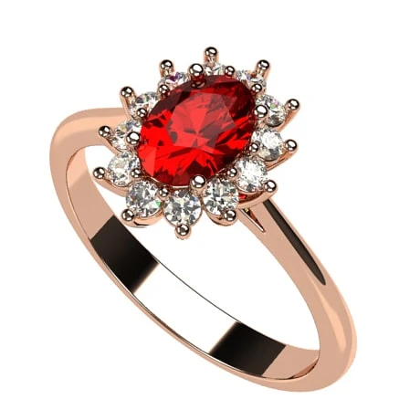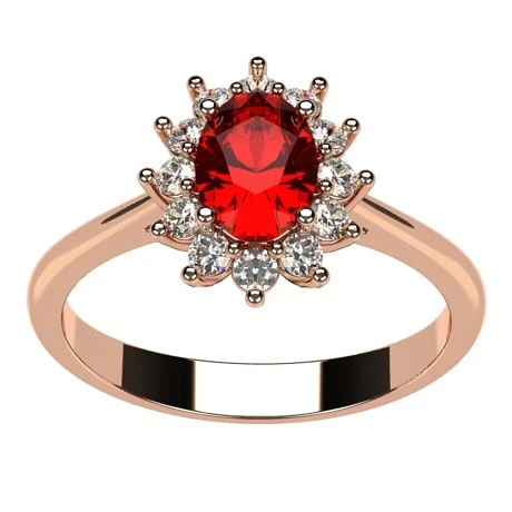 Cette bague de style pompadour se caractérise par une pierre centrale ovale entourée de 12 petits diamants sertis griffe, qui font ressortir la couleur rouge de la pierre principale de rubis.