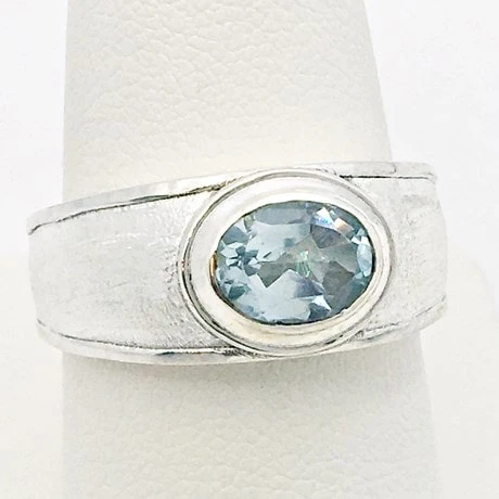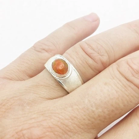 En partie supĂ©rieure se trouve une pierre naturelle sertie clos qui fait 8×6 millimètres. La pierre repose en travers du doigt ce qui donne un style plus compact et masculin au bijou.