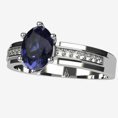 Bague majestueuse sertie d’un très joli saphir de Ceylan bleu de taille ovale et mesurant 8 par 6 millimètres et accompagné de diamants.