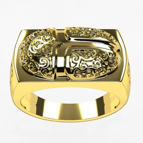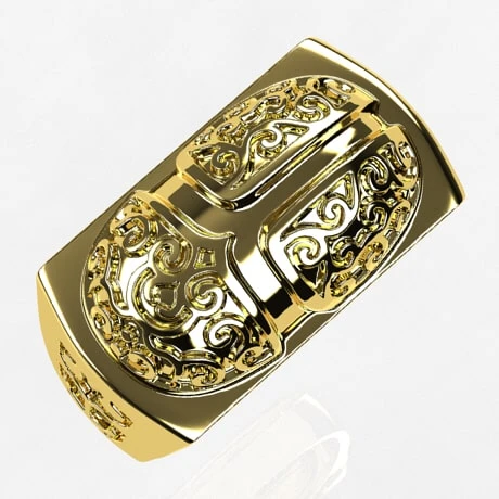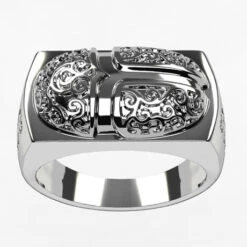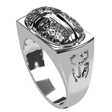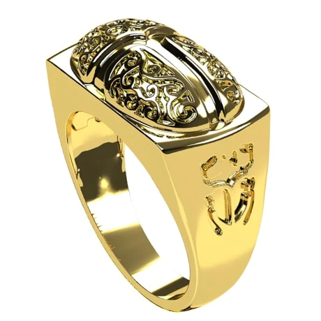 Bague de type chevailère avec un plateau rectangulaire surmonté d’une représenation d’un scarabé Égyptien moulé en relief, lesquel est orné de gravures en arabesques. Les flancs de la bague, larges, sont eux aussi marqué par une représentation gravé d’un scarabé, représentation imitant la forme de l’insecte réel.