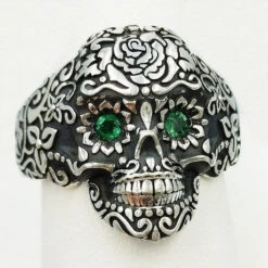 Cette bague en argent entièrement gravée de fleurs détaille les orbites du crâne, le nez et les dents d’une tête de mort souriante à l’image des calaveras mexicaines qui sont représentées lors de la fêtes des morts au Mexique, fête célébrée le premier Novembre chaque année par des offrandes de plats traditionnelles et boissons déposées sur les tombes des proches décédés.