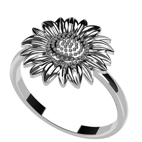 Bague au design d’une fleur de tournesol composée d’un anneau simple sur lequel est présenté une fleur de tournesol dont on reconnaît tous les détails du capitule composé des fleurons et des pétales du tournesol. Notez que si cette bague tournesol vous intéresse, vous le serez également par notre bague fleur de lotus ou argent ou en or, qui est elle aussi remarquable de par son design unique.