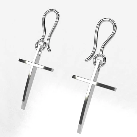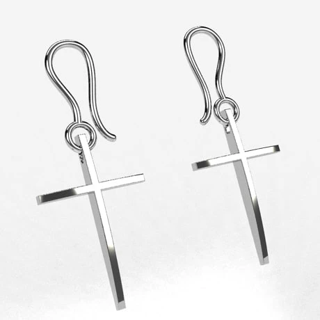 Paire de boucles d’oreilles pendante en forme de croix moderne dont le design reprend celui de notre pendentif croix moderne de notre collection. Elles présentent la forme d’une croix classique dans un style moderne avec une face bombée et un corps central assez épais.