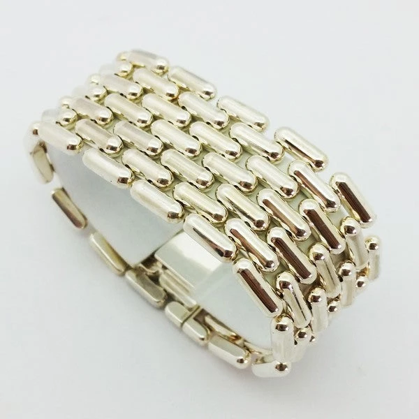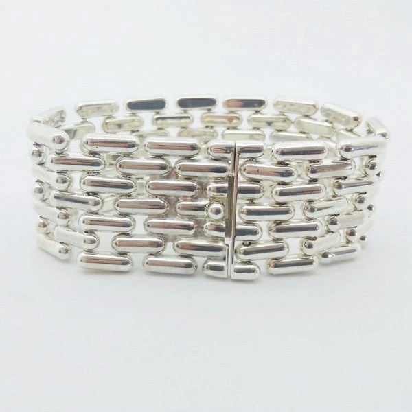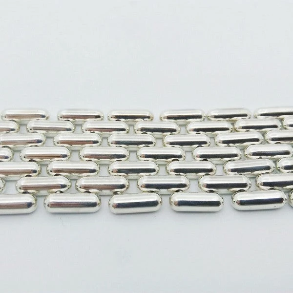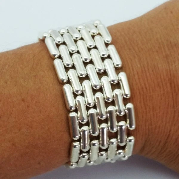 Ce type de bracelet fait environ 200 grammes en argent massif pour un bracelet pour femme de 28 millimètres de largeur, bracelet comprenant 7 maillons en largeur.