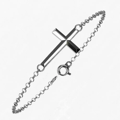 Ce bracelet est composé d’une chaîne maille jaseron de 2 millimètres de large attachée à une croix chrétienne disposée dans le sens de la longueur de la chaîne et qui se trouve donc en travers du votre poignet.