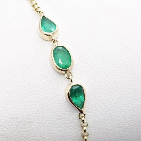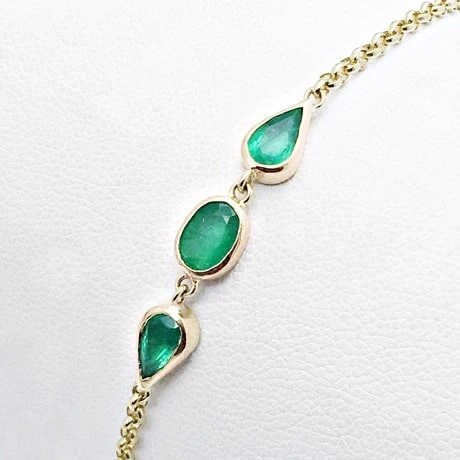 Ce bracelet est composé d’une chaîne maille jaseron de 2 millimètres de large où sont placées au centre trois pierre d’émeraude de manière symétrique. La pierre d’émeraude centrale est de forme ovale alors que les deux autres de part et d’autre sont en forme de poire.