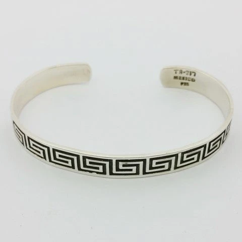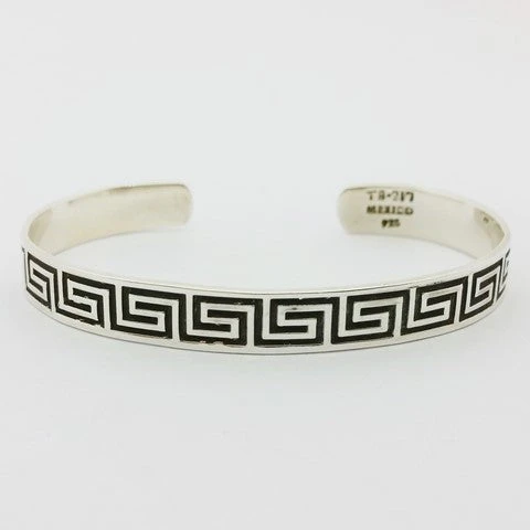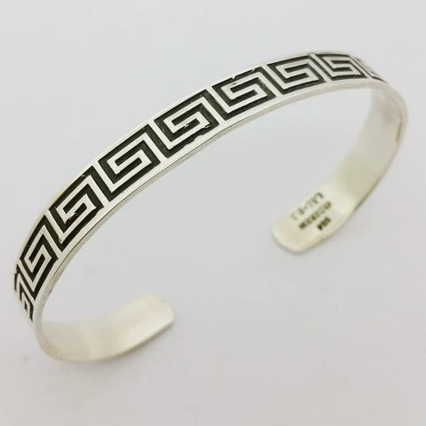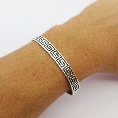 Bracelet unisexe en argent 925 composĂ© d’une plaque d’argent de 8 millimètres de large et de 1 millimètre d’Ă©paisseur gravĂ©e d’un motif grec rĂ©pĂ©tĂ©s sur toute la moitiĂ© supĂ©rieure du bracelet.