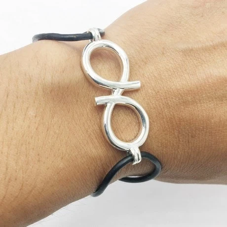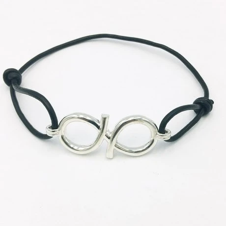 Un cordon de cuir se prend dans les deux extrémités du symbole infini se terminant à chaque extrémité par un noeud coulissant serré vous permettant d’adapter la taille du bracelet à votre poignet.