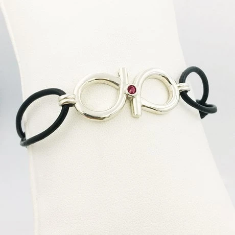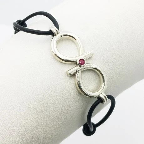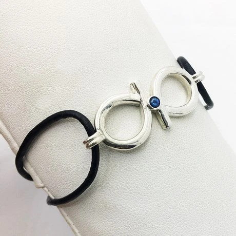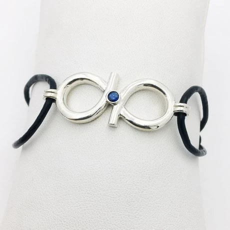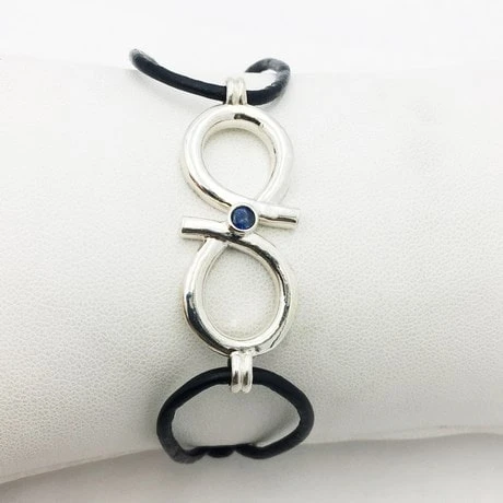 Ce dernier se compose d’un 8 renversé dont les extrémités en relief sur le corps du symbole ne se rencontrent pas, offrant ainsi une touche d’originalité et la porte ouverte afin de réaliser un bracelet infini personnalisé avec une pierre précieuse de couleur sertie entre ces deux extrémités.