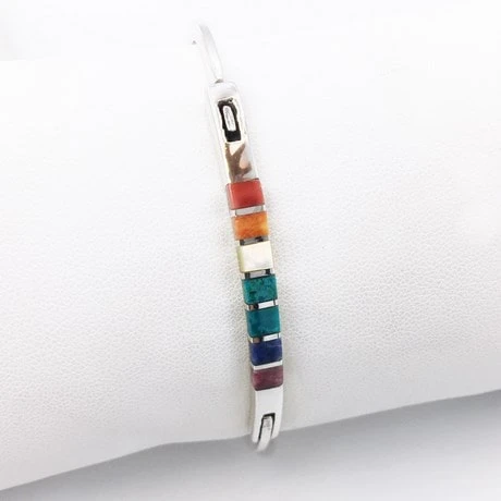 Les pierres incrustées sur le bracelet sont la pierre de lapis-lazuli, de la turquoise, pierre de malachite, de la nacre, du spondylus et de la pierre de jaspe. Remarquez comment les teintes douces de ces pierres sont mises en valeur par l’argent poli du corps du bracelet.