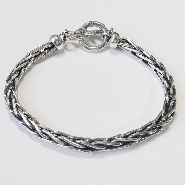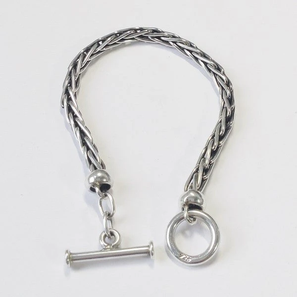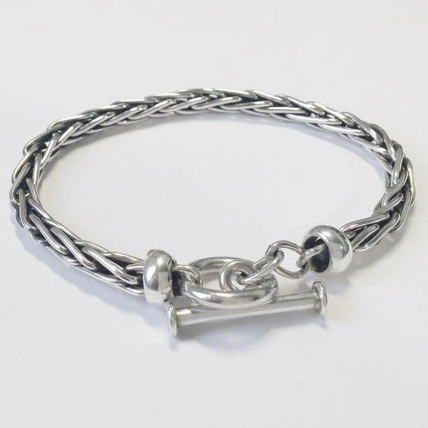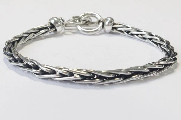 Il est fait de fils d’argent, de un millimètre de diamètre, enlacés les uns-aux-autres à la façon d’une tresse. Le corps du bracelet fait 5 mm de diamètre et le bracelet à une longueur totale de 19,5 cm pour un poids de 23 grammes.