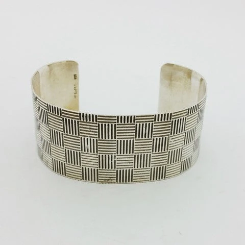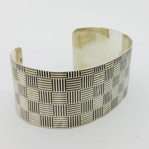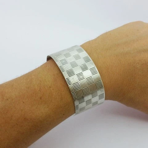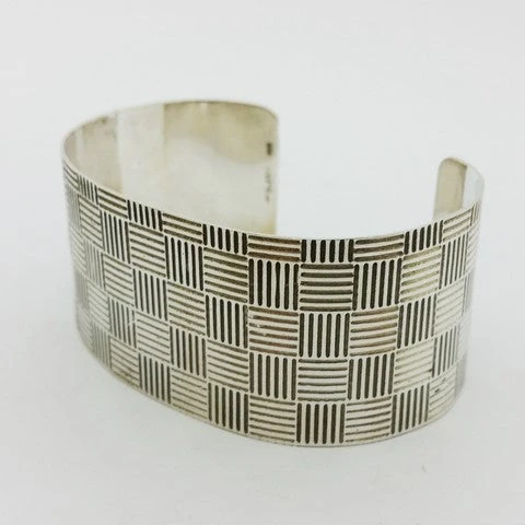 Manchette en argent massif décorée de motifs carrés gravés de lignes. D’un carré à l’autre les lignes gravées sont perpendiculaires, ce qui permet de donner un style à la fois sobre mais hypnotisant au regard. Notez que le motif gravé sur le bijou est présent sur la totalité du bijou, aussi bien sur le dessus qu’au niveau de ses extrémités situées sous le poignet.