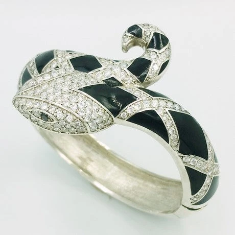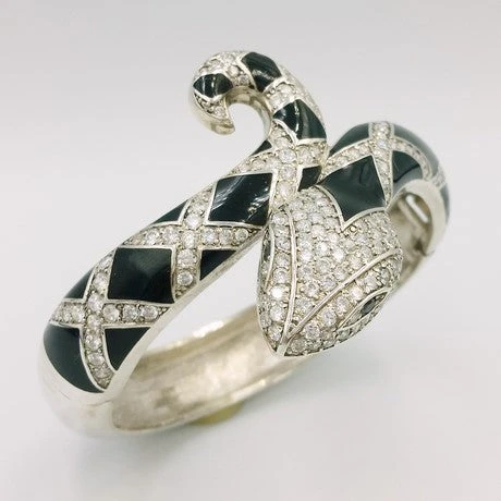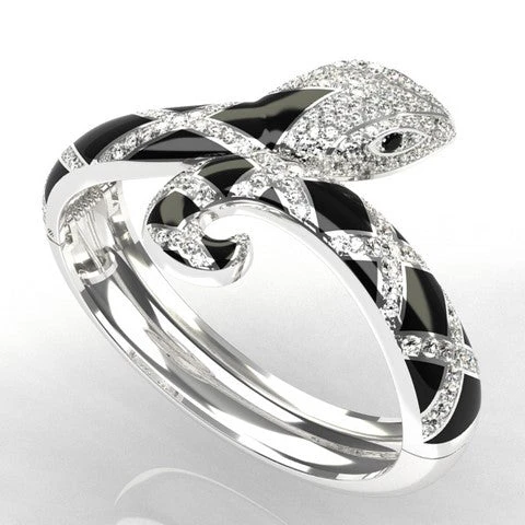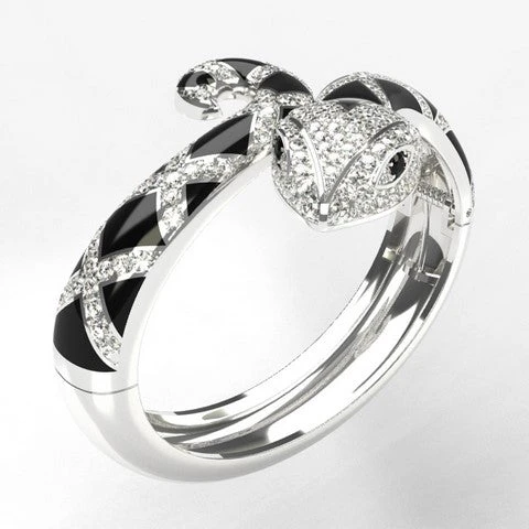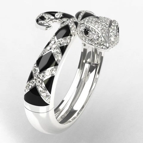 Comme vous le remarquerez sur les visuels, sur la partie supérieure du bracelet, le corps du serpent est décoré d’écailles géométriques en forme de losanges irréguliers décorés de laque noire qui donnent un effet de contraste saisissant avec le reflet de l’argent poli.